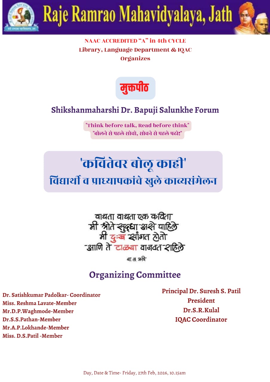 'कवितेवर बोलू काही' विद्यार्थी व प्राध्यापकांवे खुले काव्यसंमेलन दिनांक २७/०२/२०२६ रोजी.