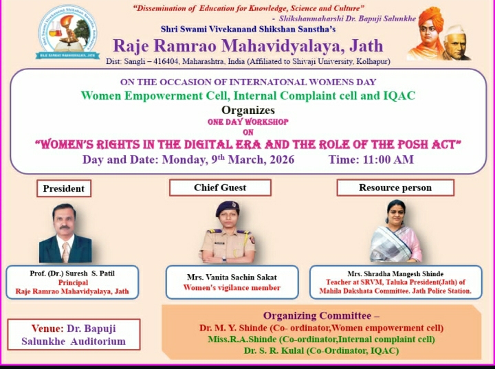ONE DAY WORKSHOP ON "WOMEN'S RIGHTS IN THE DIGITAL ERA AND THE ROLE OF THE POSH ACT" on Monday, 9th March, 2026.