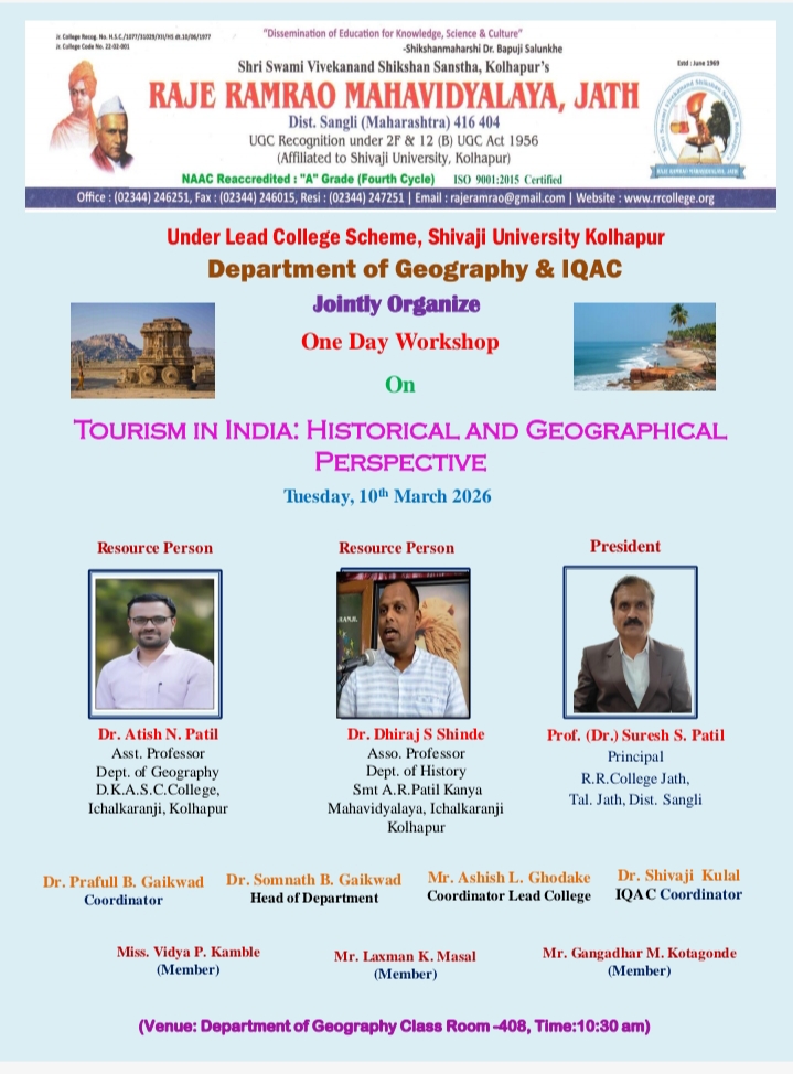 One Day Workshop On TOURISM IN INDIA: HISTORICAL AND GEOGRAPHICAL PERSPECTIVE on 10th March 2026.