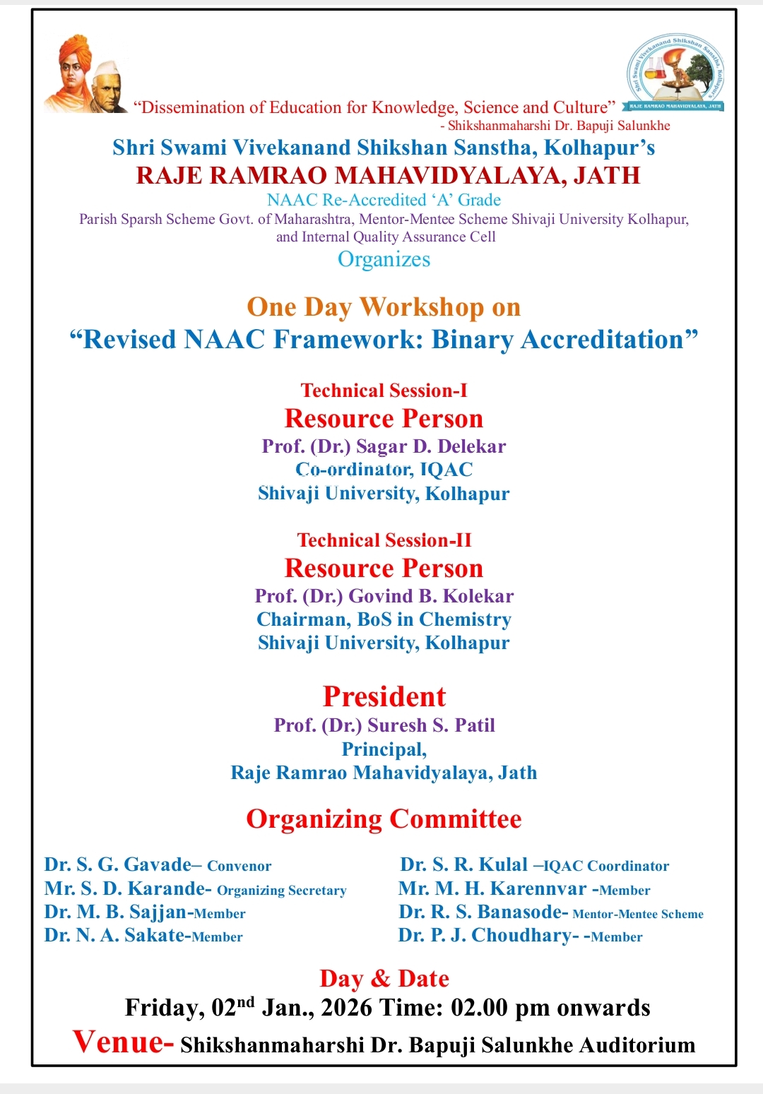 One Day Workshop on "Revised NAAC Framework: Binary Accreditation" on 2nd January 2026.