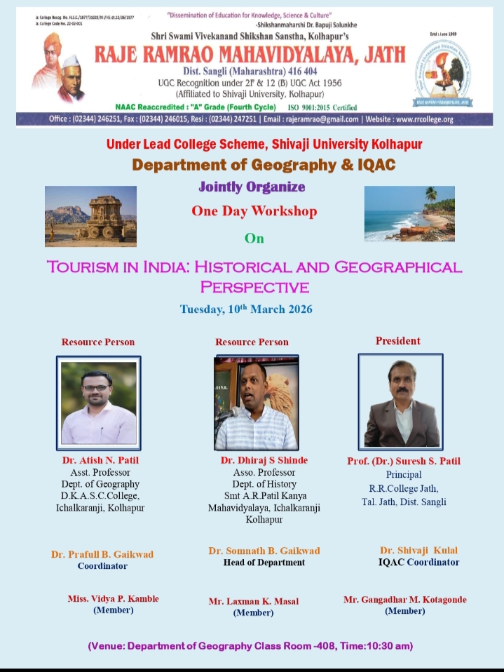One Day Workshop On TOURISM IN INDIA: HISTORICAL AND GEOGRAPHICAL PERSPECTIVE on 10th March 2026.