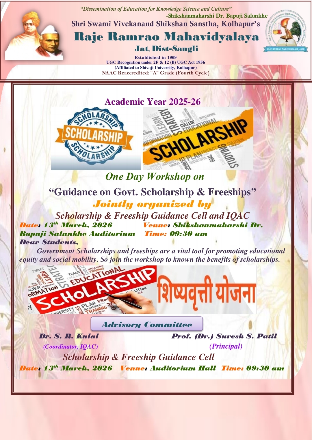One Day Workshop on "Guidance on Govt. Scholarship & Freeships" on 13; March 2026.