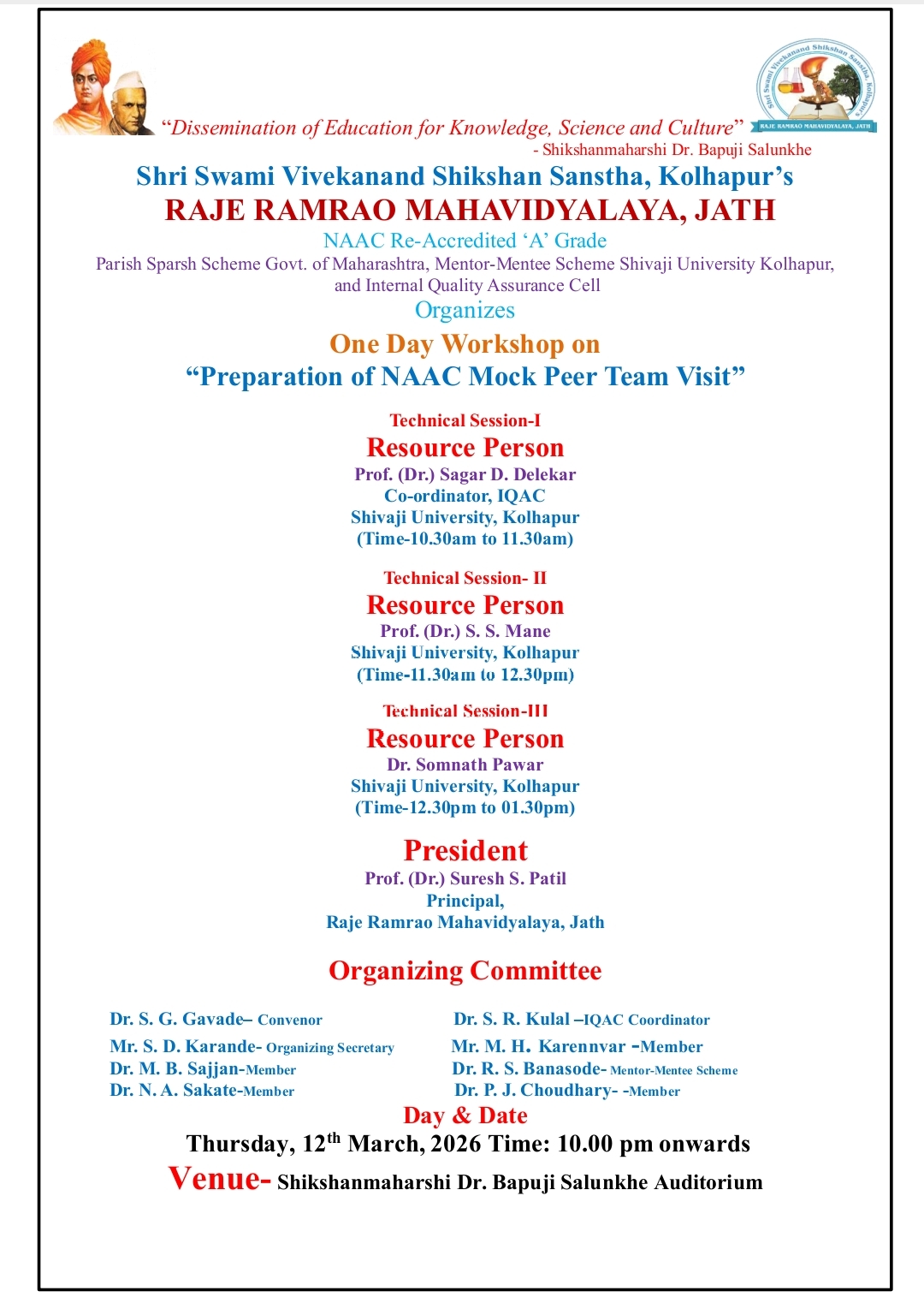 One Day Workshop on “Preparation of NAAC Mock Peer Team Visit” on 12th March 2026.