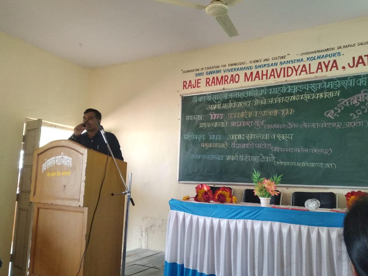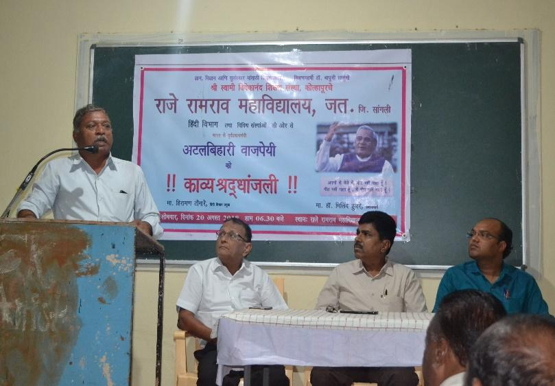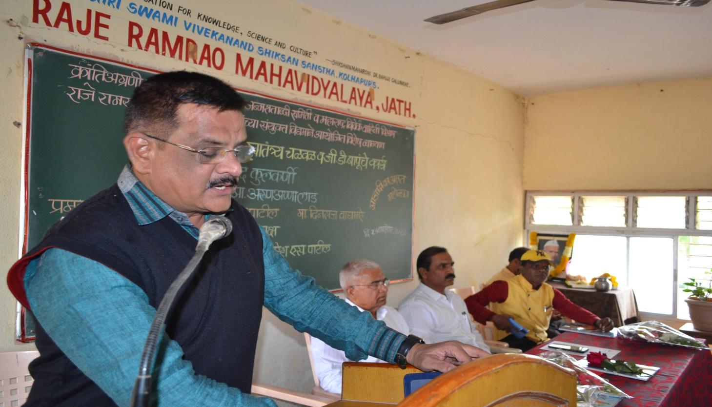 भारतीय स्वातंत्र्य चळवळ व जी.डी.बापूंचे कार्य या विषयावर मार्गदर्शन करतांना मा.आ.अरुण अण्णा लाड उपस्थित महाविद्यालयाचे प्राचार्य डॉ.सुरेश पाटील प्रमुख पाहुणे मा.प्रसाद कुलकर्णी दिनराज वाघमारे व प्रा.हिरामण टोंगारे.