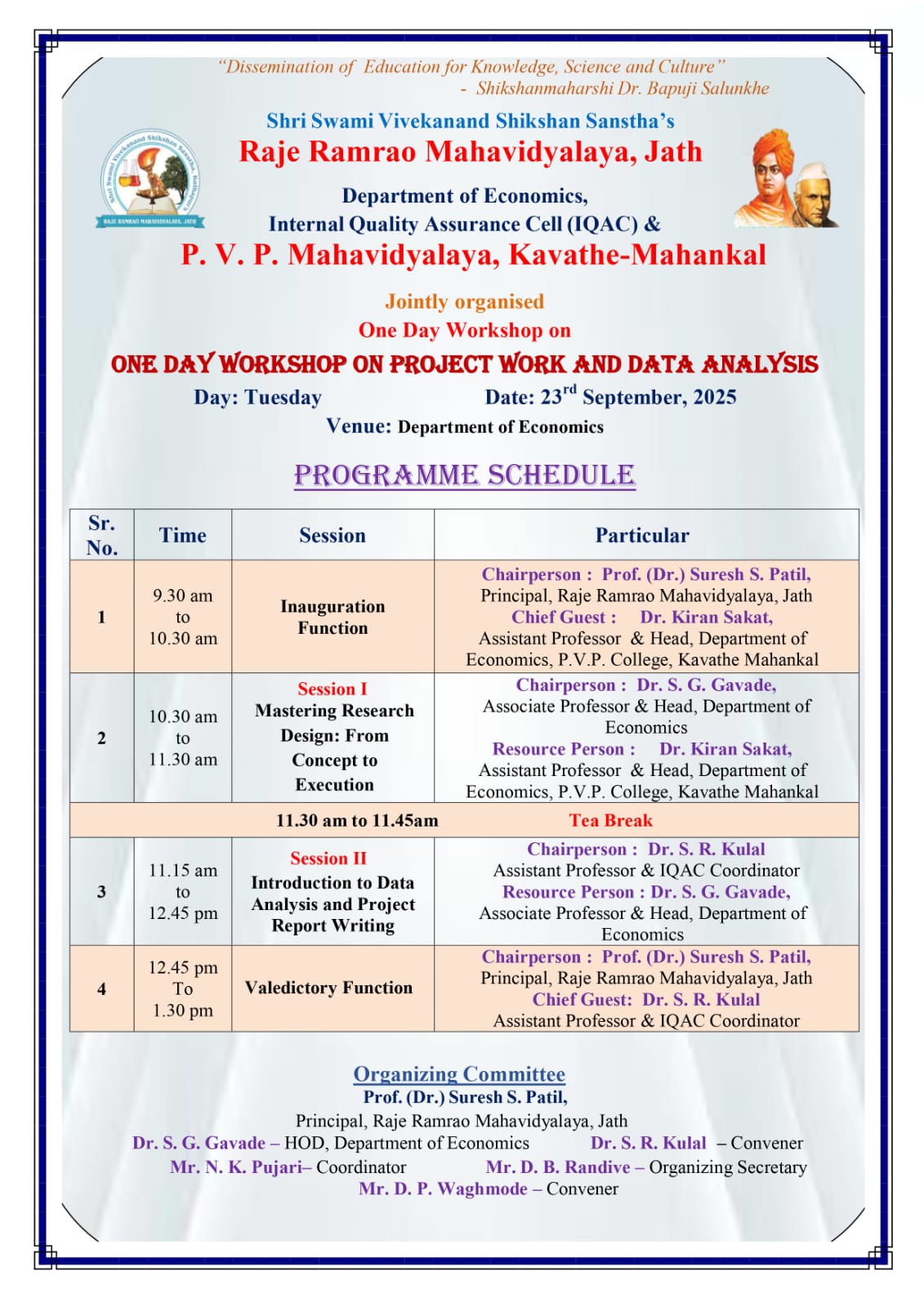 "ONE DAY WORKSHOP ON PROJECT WORK AND DATA ANALYSIS" on 23th September 2025.